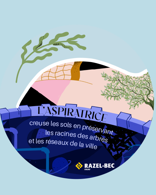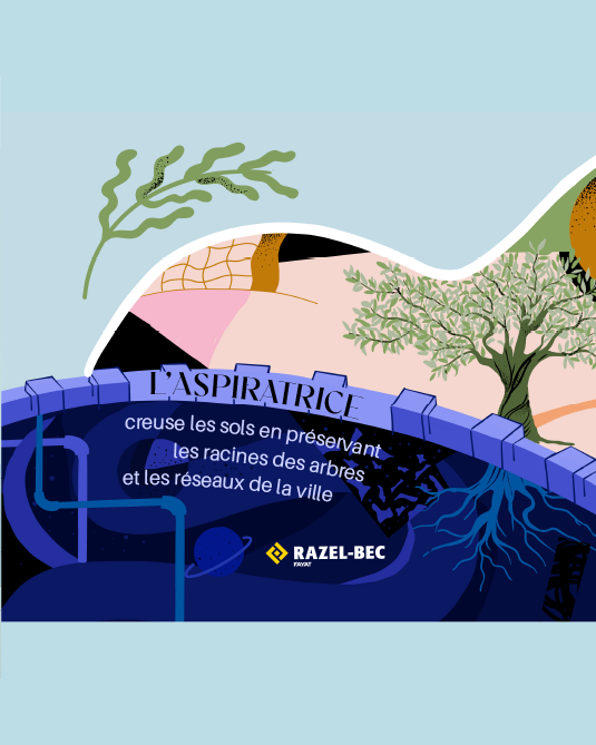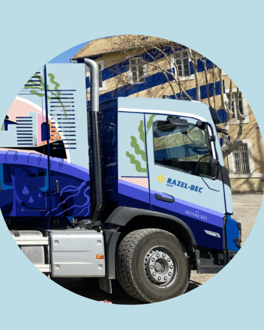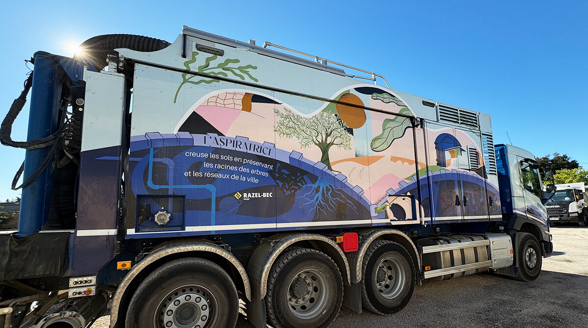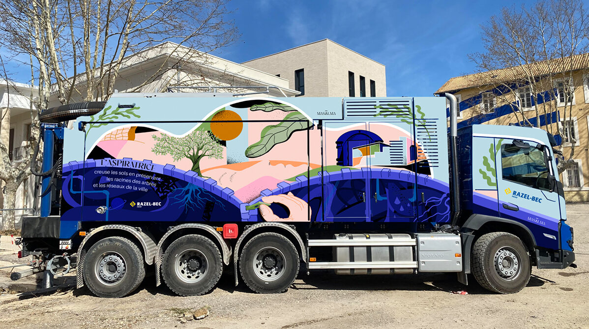 Pour Razel-Bec (Groupe Fayat), j’ai imaginé une illustration grand format appliquée sur une aspiratrice de chantier, transformant cet outil technique en œuvre mobile dans l’espace public.